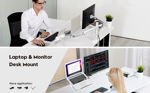 This 2-in-1 computer and laptop mount can be flexible to adjust the height ,length and angle .No matter how you sit or stand ,it can always adjust the most suitable position to you. It’s material use high strength durable aluminum alloy and it’s weight can reach 7.3 pounds , that is almost twice weight than other mainstream product in the Market . Designed for desk, end table, coffee table of which the thickness of edge is between (0.6"-2.36")1.5cm-6cm thick, or requires a hole diameter of (2.76")7cm
